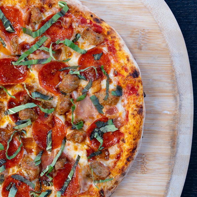10" $25.00 | 14" $33.00 • Red sauce, mozzarella, pepperoni, sausage, prosciutto, bacon, and basil